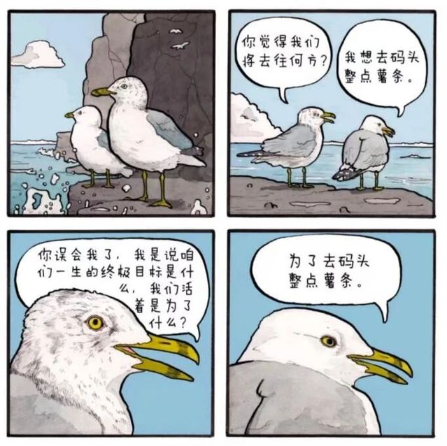 这句话出自加拿大网红艺术家乔舒亚·巴克曼《我能有什么坏心思呢》书中的一幅漫画,里面两只海鸥的对话引起了人们的共鸣。当一只海鸥思索飞行的方向时,另一只淡然回应:我打算去码头整点薯条。