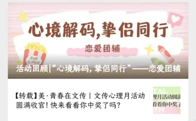 在这里,你可以策划并沉浸于多元心理活动的创意浪潮;在这里,你可以定格那些稍纵即逝的美好瞬间,为珍贵记忆镀上永恒的光晕;在这里,你可以体悟四季流转,于方寸海报间勾勒节气变化的诗意;在这里,你可以化作文字的织梦者,用推文编织心灵锦缎,传递心理知识的火种;在这里,你可以在思想的星空下,与同好者并肩探寻心理学的无垠宇宙,让共同成长的轨迹交织出璀璨星河。在这里,你可以在团辅活动中学会如何更好地倾听他人,理解他人,成为他人生命中不可或缺的支持者。