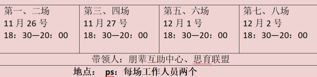 幸福联盟朋辈互助中心带领奇数场、思育联盟和幸福联盟朋辈互助中心共同带领偶数场。